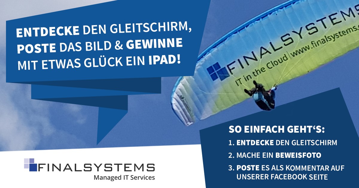 Zur Teilnahme berechtigt sind alle natürliche Personen mit einem aktiven Facebook-Account. Das Gewinnspiel beginnt am 01.07.2021 und endet am 17.08.2021 um 23:59 Uhr. Personen die Bilder nach diesem Zeitpunkt posten können nicht bei der Verlosung mit einbezogen werden. Die Verlosung findet am 20.08.2021 per Zufallsprinzip statt. Der Gewinner/die Gewinnerin wird von uns veröffentlicht und per Privatnachricht benachrichtigt. Sollte die Privatnachricht an den Gewinner/ die Gewinnerin nicht innerhalb von 24 Stunden beantwortet werden, findet die Verlosung erneut statt. Der Gewinn kann nicht in Bar ausbezahlt werden. Der Gewinner/die Gewinnerin erklärt sich dazu einverstanden, dass dessen Name/Facebook-Account auf Facebook (in unserem Firmenprofil) veröffentlicht wird. Der Rechtsweg ist ausgeschlossen. Eine Teilnahme am Gewinnspiel ist ausschließlich zu den hier aufgeführten Bedingungen möglich. Mit der Teilnahme erkennt der Teilnehmer diese Teilnahmebedingungen ausdrücklich an. Der Veranstalter behält sich vor, das Gewinnspiel zu jedem Zeitpunkt ohne Vorankündigung und ohne Angabe von Gründen abzubrechen oder zu beenden. Soweit im Rahmen des Gewinnspiels personenbezogene Daten von Teilnehmern erfasst werden, werden diese vom Veranstalter ausschließlich zum Zwecke der Durchführung des Gewinnspiels erhoben, verarbeitet und genutzt sowie nach Beendigung des Gewinnspiels gelöscht. Das Gewinnspiel wird in keiner Weise von Facebook gesponsert, unterstützt oder organisiert. Ansprechpartner und Verantwortlicher ist allein die FS Final Systems GmbH. Vom Gewinnspiel ausgeschlossen sind Mitarbeiter und deren Angehörige der Final Systems und Mitglieder der in NRW ansässigen Flug/Gleitschirmvereine.